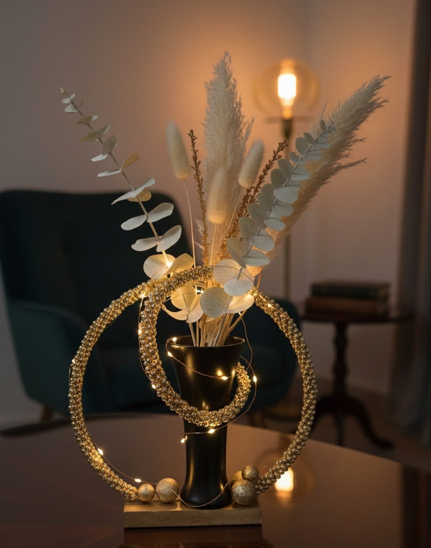 Aranjament floral elegant pentru centrul mesei, realizat din flori artificiale de inalta calitate ce nu se ofilesc. Design minimalist si rafinat, perfect pentru ocazii speciale sau pentru decorarea permanenta a casei.