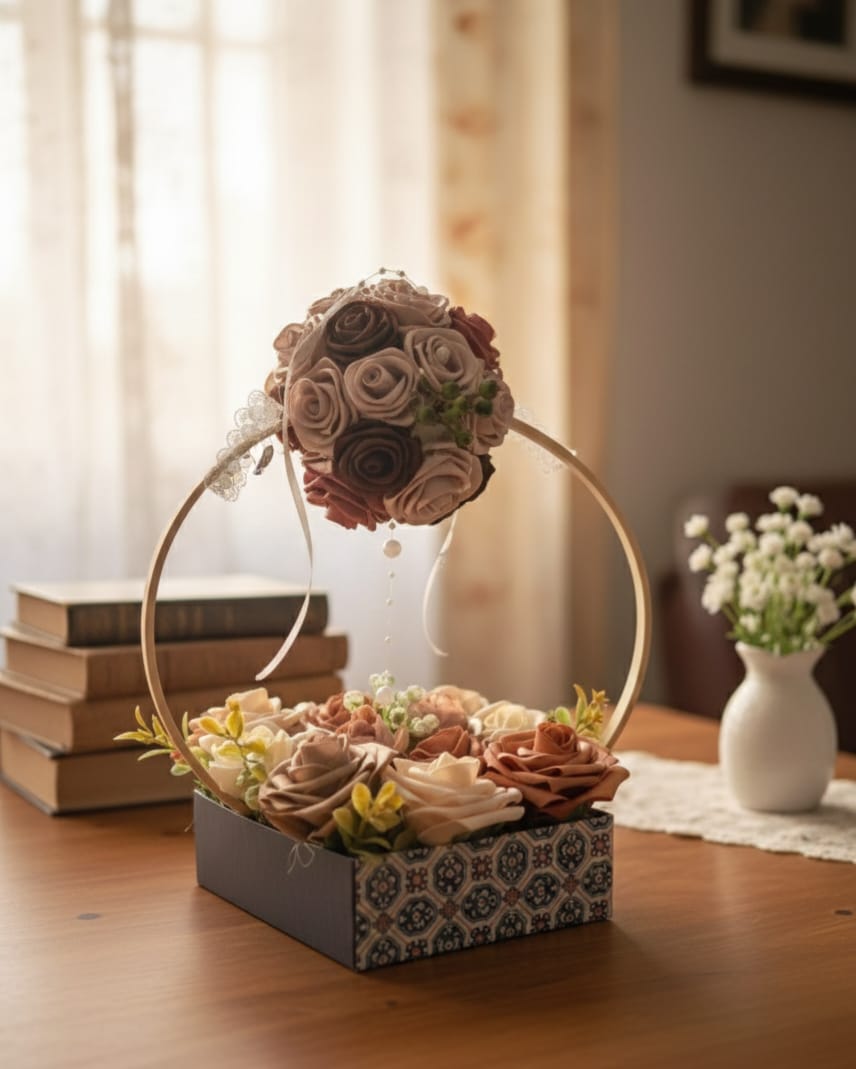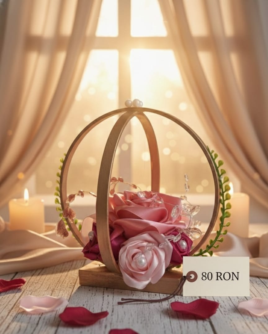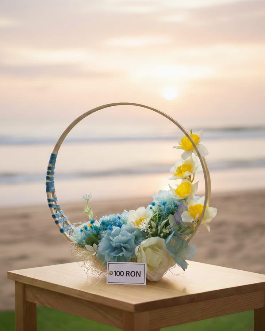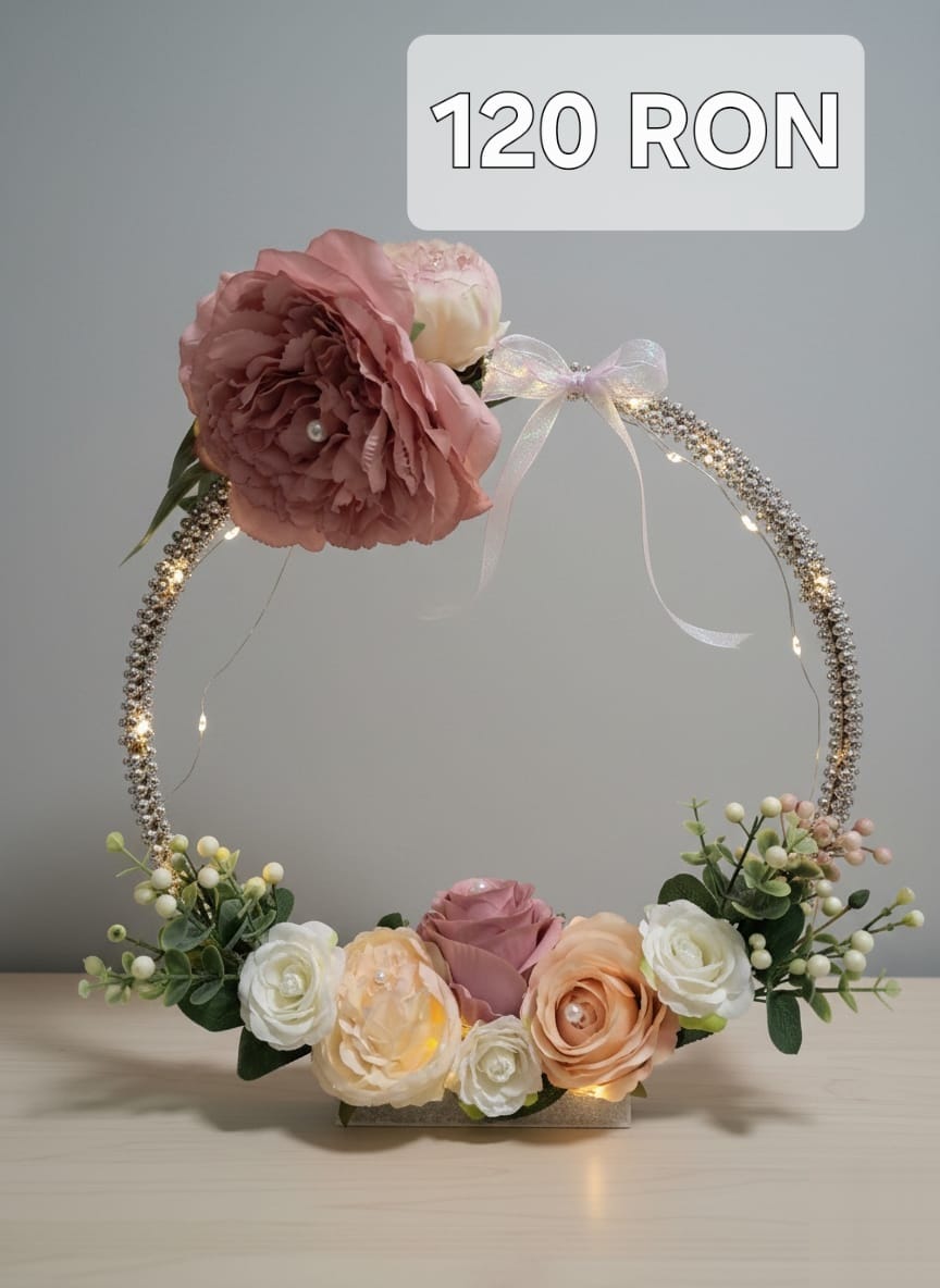 Aranjament floral suspendat, modern si elegant. O piesa de decor sculptural care atrage toate privirile. Realizat din ramuri naturale tratate si flori artificiale de calitate superioara.
