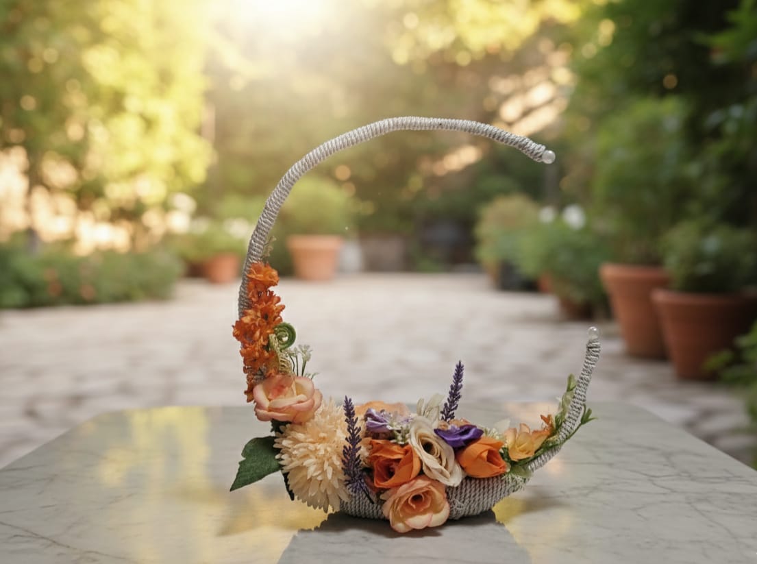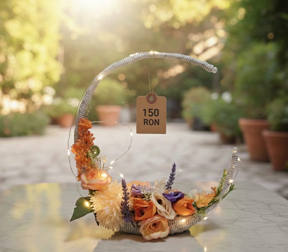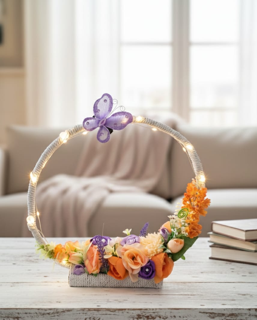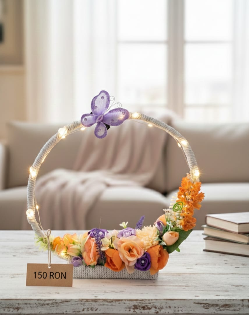 Coronita vibranta de primavara pentru usa, realizata cu flori artificiale colorate si verdeata proaspata. Aduce o nota de optimism si veselie la intrarea in casa ta.